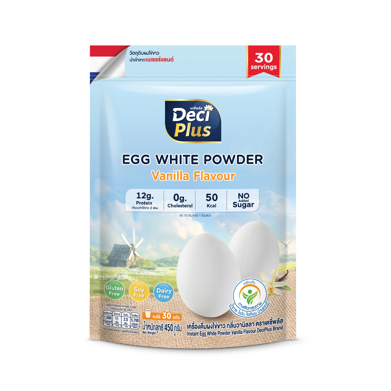 DeciPlus (เดซี่พลัส) เครื่องดื่มโปรตีนไข่ขาวแท้ๆ 99% กลิ่นวานิลลา ผงไข่ขาวนำเข้าจากเนเธอร์แลนด์ ปราศจากกลูเต็น, นมวัว, ถั่วเหลือง ได้รับสัญลักษณ์ทางเลือกสุขภาพ มีค่าไขมัน น้ำตาล โซเดียมผ่านเกณฑ์
