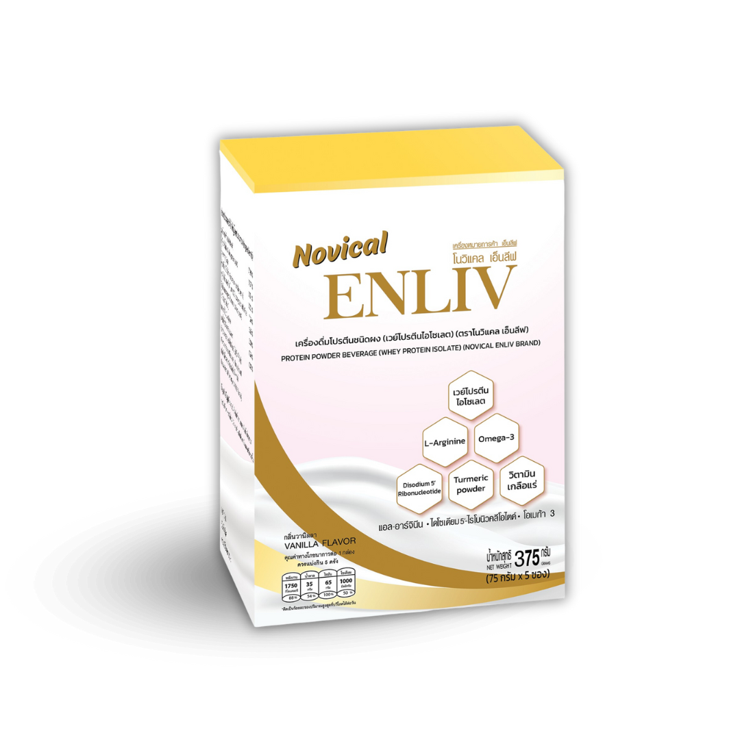 Novical Enliv (โนวิแคล เอนลีฟ) เครื่องดื่มเวย์โปรตีนชนิดผง สูตรครบถ้วน งานวิจัยจากคณะแพทย์ศาสตร์ จุฬาลงกรณ์มหาวิทยาลัย ทดสอบกับผู้ป่วยมะเร็งที่ผ่าตัดที่รพ.จุฬาลงกรณ์