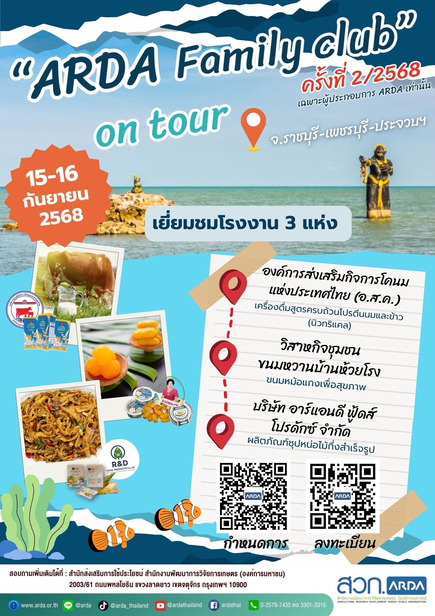 บริษัท ชู บลิส จำกัด ผู้ดำเนินธุรกิจด้านโภชนาการและสุขภาพ ภายใต้แบรนด์ Take Care Plus ได้รับเกียรติจาก สำนักงานพัฒนาการวิจัยการเกษตร (สวก.) เข้าร่วมกิจกรรม ARDA Family Club On Tour ระหว่างวันที่ 15 – 16 กันยายน 2568 โดยมุ่งเน้นการเยี่ยมชมโรงงานและวิสาหกิจชุมชนที่ได้รับทุนวิจัยจาก สวก. ใน 3 จังหวัด ได้แก่ ราชบุรี เพชรบุรี และประจวบคีรีขันธ์