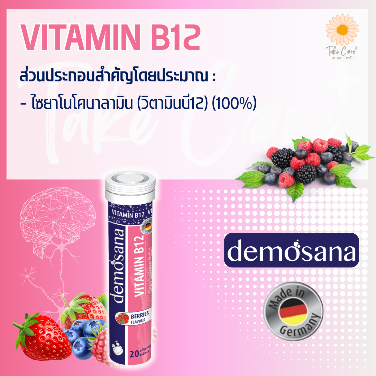 Demosana [ดีโมซานา] เม็ดฟู่เสริมอาหาร วิตามิน แมกนีเซียม แคลเซียม ซิงค์ 20 เม็ด 82 กรัม จากเยอรมนี (วิตามิน บี12 กลิ่นเบอร์รี่)