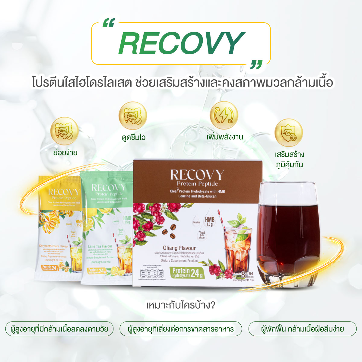 Recovy โปรตีนชนิดผงชงดื่มใส ไฮโดรไลเสต เป็นเปปไทด์หรือกรดอะมิโนขนาดเล็กกว่าโปรตีนทั่วไป ทำให้ดูดซึมได้ง่ายขึ้น มี HMB (Beta-Hydroxy-Beta-Methylbutyrate) ฟื้นฟูกล้ามเนื้อและลดการสลายของกล้ามเนื้อในร่างกาย รวมถึงมี Betaglucan ที่เป็นใยอาหาร