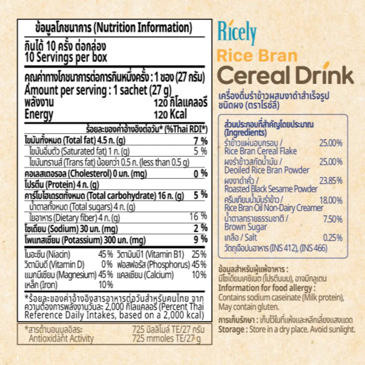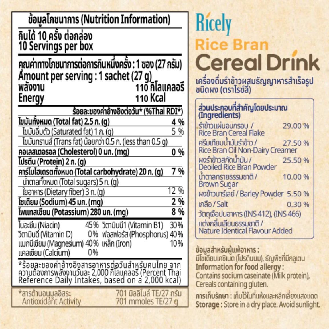 Ricely [ไรซ์ลี่] เครื่องดื่มรำข้าวผสมธัญญาหารสำเร็จรูปชนิดผง และสูตรผสมงาดำ ขนาด 270 กรัม (27 กรัม x 10 ซอง)