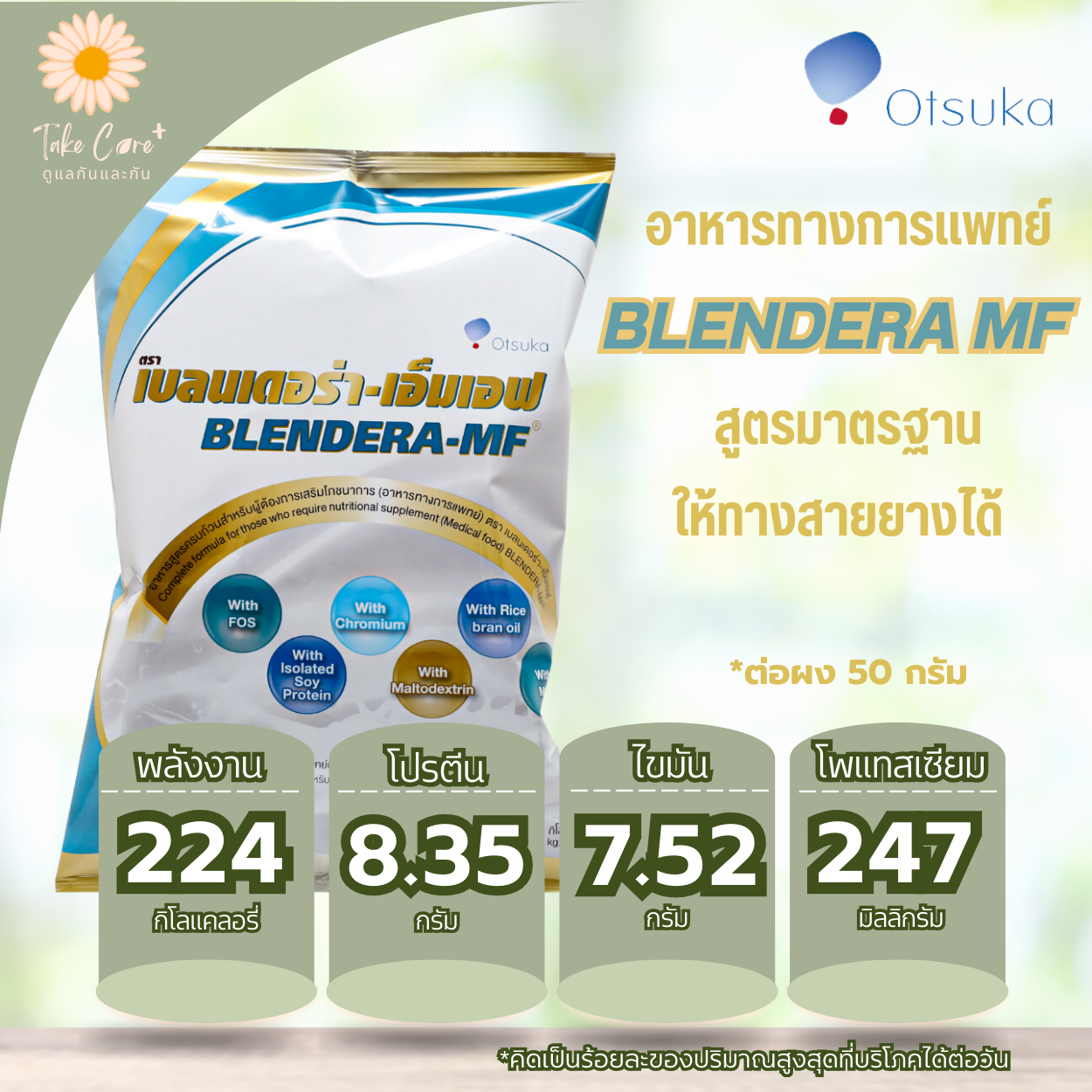 Blendera MF เบลนเดอร่า-เอ็มเอฟ อาหารทางการแพทย์ ขนาด 2.5 กก. ยกลัง 4 ถุง ประกอบด้วย โปรตีน คาร์โบไฮเดรต ไขมัน วิตามินและแร่ธาตุ ใช้เป็นอาหารเสริมโภชนาการ สำหรับผู้ที่มีความเสี่ยงต่อการเกิดภาวะทุพโภชนาการหรืออาจใช้แทนอาหารปั่นในโรงพยาบาล ตามคำแนะนำของแพทย์ สามารถให้ทางสายยางได้