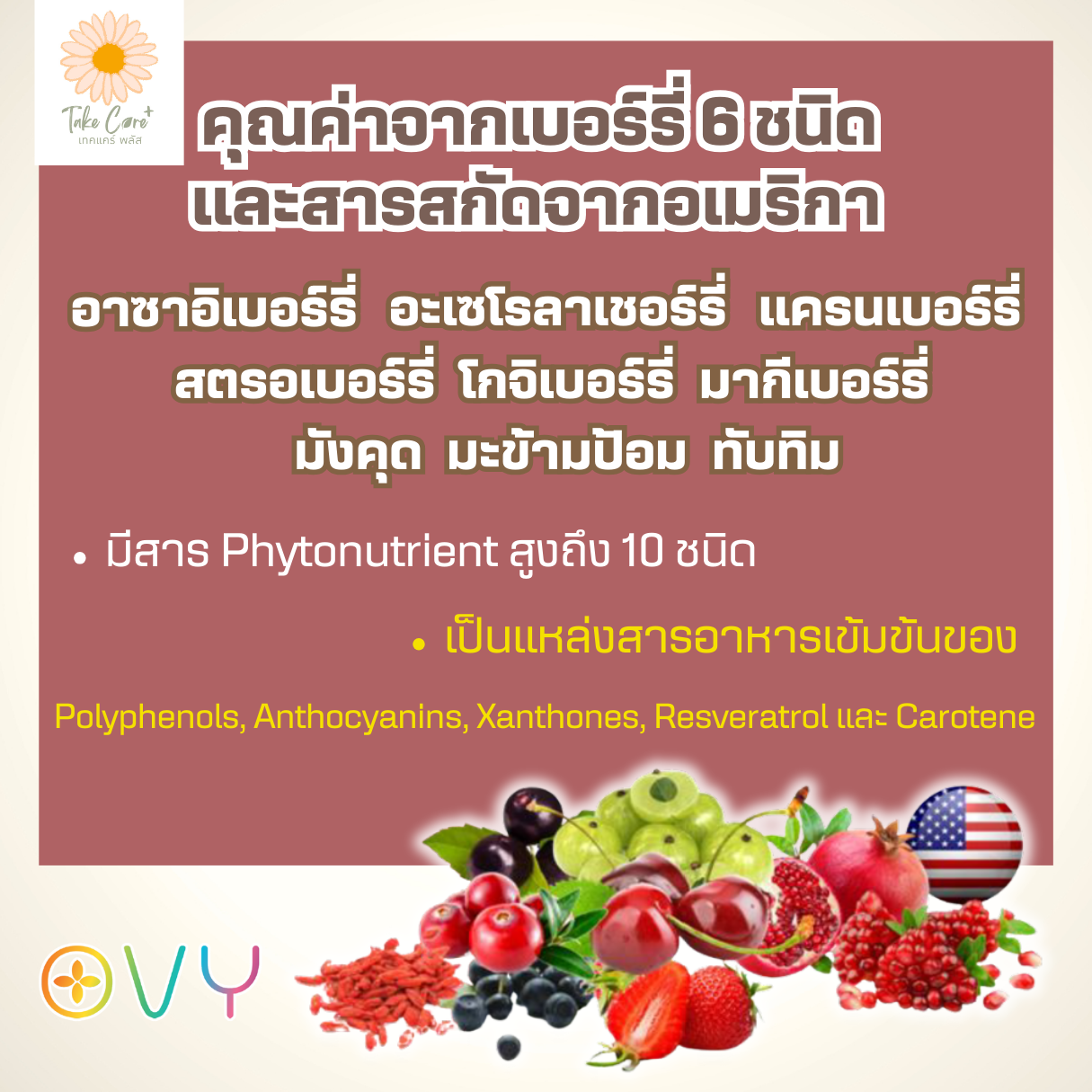 • เบอร์รี่ 6 ชนิดและสารสกัดชนิดจากผลไม้ 3 ชนิด จาก USA. ได้แก่ อาซาอิเบอร์รี่, มะข้ามป้อม, โกจิเบอร์รี่, สตรอเบอร์รี่, ทับทิม, อะเซโรลาเชอร์รี่, มังคุด, แครนเบอร์รี่และมากีเบอร์รี่